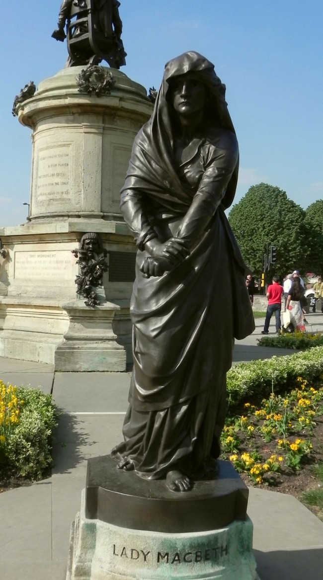 Most of the photographs show the devastating fire, with smoke billowing up from the theatre. My favourites though, are the rarely seen ruins of the building taken a few days later. Among the twisted metal and debris, through one of the gaps where a window once stood, can be seen the image of a woman wringing her hands in despair. It is the statue of Lady Macbeth during the sleepwalking scene. At the time of the fire the Gower Memorial, which was moved when the theatre was rebuilt, was just outside the theatre and it’s an amazing coincidence that of the four statues (Lady Macbeth (tragedy), Prince Hal (history), Falstaff (comedy) and Hamlet (philosophy) it’s the tragic figure that is just in view.